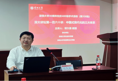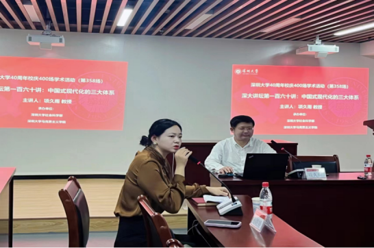On the afternoon of March 11, the 40thAnniversary Lecture Series of Shenzhen University and the Lecture No. 160 of the Forum of Shenzhen University began in Conference Room 2623, Huiwen Building, Yuehai Campus. Professor Xiang Jiuyu, a professor and doctoral supervisor of Wuhan University, a distinguished professor of Cheung Kong Scholars Program of the Ministry of Education, and an expert entitled to the special allowance of the State Council, gave an excellent lecture as the keynote speaker on the theme of Three Systems of Chinese Path to Modernization to the teachers and students of Shenzhen University. The lecture was hosted by Sun Tingting,Deputy Dean of the Marxism College of Shenzhen University, and a number of teachers and students attended the lecture and participated in the discussion.