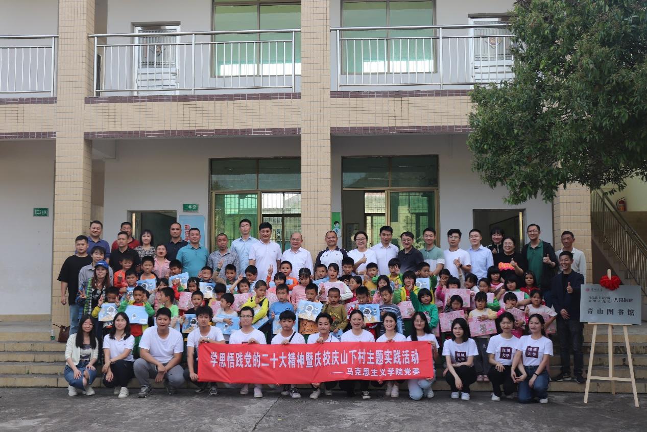 The CPC Committee of the Marxism College is committed to learning, thinking about, practicing and comprehendingthe spirit of the 20thParty Congress, deepening education on learning and acting on Xi Jinping Thought on Socialism with Chinese Characteristics for a New Era, and implementing the policies and plans made by the CPC Central Committee and the State Council to mobilize social resources to consolidate and expand the achievements in poverty alleviation and integrate rural revitalization organically. To this end, the Marxism College promotes the Marxist style of study, adheres to the unity of knowledge and action and learning for practice, gives full play to its academic strengths in Marxism theory, and heightens the awareness of contribution and the ability to serve the society with theories among the faculty and the students, in line with the fundamental mission of higher education, that is, cultivating virtues in students, and the goal of postgraduate education of the College. On April 20, a group of students and faculty members from the Marxism College visited Shanxia Village, Liyuan Town, Heping County, Heyuan City for the donation and inauguration ceremony of Qingshan Library turnkey project at Shanxia Primary School. 2,324 books and some sports supplies were donated. Each of the 52 children at Shanxia Primary School received a stationery package. Present at the ceremony were 30 students and teachers including Wang Hong, member of the Standing Committee of the CPC Committee of SZU and Secretary of the CPC Committee of the Marxism College, Dean Fu Heming, Deputy Secretary Chen Yiming, teachers and counsellors of ideology and politics, members of Party building organizations, and postgraduate students who are Party members or activists about joining the Party. Also present wereLiu Jianyi, Vice Chairman of the People's Congress of Liyuan Town and head of the working group of Shanxia Village, Zou Haipiao, secretary of the CPC Committee branch and head of the Committee of Shanxia Village, Wang Weiwei, leader of the task force for rural revitalization at Liyuan Town and cadre of the Municipal Committee of the Communist Youth League, Yang Zhenyu, deputy leader of the task force for rural revitalization at Liyuan Town, first secretary of Shanxia Village and teacher of theMarxismCollege, Yang Jian, member of the task force for rural revitalization at Liyuan Town and teacher of the Organization Department, Wang Jiang, member of the task force for rural revitalization at Liyuan Town, first secretary of Chilong Village and teacher of the Communist Youth League Committee of SZU, and Huang Jinnong, Principal of Shanxia Primary School, together with 52 students and some villagers.