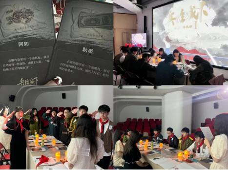 图1.学生参与红色剧本杀现场合照 一、“岁月峥嵘”的一行悲壮体验 “红色剧本杀” 以家国情怀作为主基调,选取《孤城》《月山公馆》《兵临城下》《千佛梦》等4个剧本,让身处和平年代、很难设身处地体会到战争苦难的学生们从历史的旁观者转化为历史的亲历者,用心感受历史,感悟“坚持真理、坚守理想,践行初心、担当使命,不怕牺牲、英勇斗争,对党忠诚、不负人民”的伟大建党精神。 以剧本《月山公馆》为例,1927年的中国,内忧外患,军阀混战,民不聊生,革命浪潮风起云涌,无数国人都在黑暗中摸索与奋斗。而在白色恐惧的高压下,对抗、猜疑、周旋、交锋,不断上演。有时真实也是一场虚伪的假象,而假象中却暗藏玄机……《月山公馆》以此为背景,重现了日军逼临前国家生死存亡的至暗时刻,展示了革命先辈们筚路蓝缕、艰苦斗争的历史。 长达5小时的剧本杀结束后,学生李莉感慨道:“在剧本中大家面临着无数选择,有关于生命、情感、牺牲的。情节中还穿插了‘寻找深蓝’的任务,需要我们认真去听、去记、去破译,在最后的抉择中,我和同学们都被革命先烈们的家国情怀深深感染。”