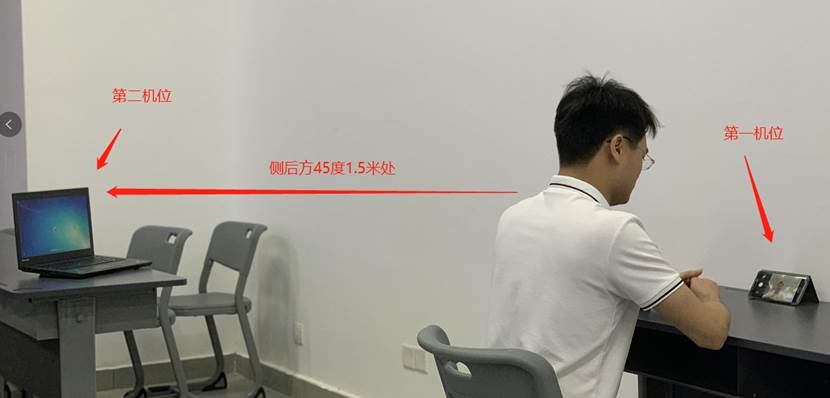 考生自行选择复试场所,要求空间封闭且整洁,环境相对安静、独立、光线明亮(不反光);考生复试时需面向墙面(间隔不超过1米),可视范围内不能有任何与复试内容相关的参考资料,应试场所不能有他人在场。第二机位放置于考生侧后方45度1.5米处。参考环境如下: