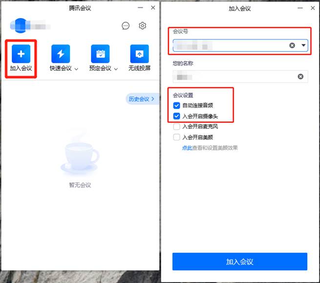 3.考生第二机位打开“腾讯会议”,输入复试会议ID进入复试会议。“入会选项”中选择“自动连接音频”、开启摄像头,关闭麦克风和扬声器。