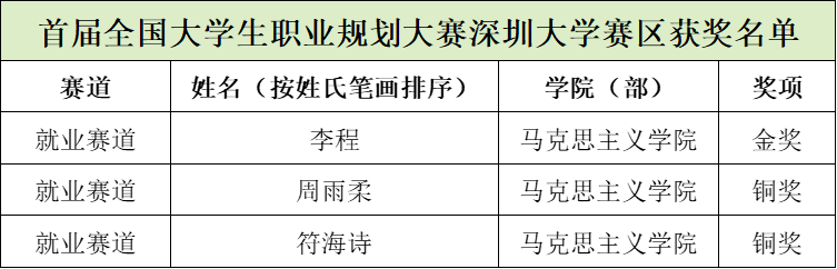 2023年12月3日,在首届全国大学生职业规划大赛(深圳大学赛区)决赛中,马院学子斩获1金2铜:2022级研究生李程同学获金奖;2022级研究生周雨柔、符海诗2名同学获铜奖。热烈祝贺以上获奖同学,感谢罗晶、冯金宇、边克冰等多位指导老师的辛勤付出。