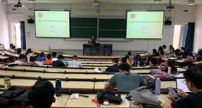 首先,徐建华教授向同学们讲述了疫情危机的“震中”转移,即从东亚国家到欧美、印度和南半球的转移,分析了不同的疫情应对策略,特别指出中国的应对成功主要是基于制度优势、群众觉悟以及强大的基层动员能力,这也是国家软实力的一种体现。其次,徐建华教授强调,对于国际格局和中美关系的影响,疫情并没有改变方向,而是加快了速度。在疫情之前,大国之间,特别是中美两国之间的力量对比就已经发生了深刻变化。美国对于华为等中国高科技企业的封杀正是基于这种担心。最后,徐建华教授分析了修昔底德陷阱和金德尔伯格陷阱,指明在不可能发生全面战争的情况下,大国之间对于规则制定权的争夺将更加激烈。未来中美关系将如何演变充满了不确定性,对于面临的困难中国要有足够的心理准备,沉着应对当前的复杂局面,化压力为改革动力,将挑战转换成机遇。