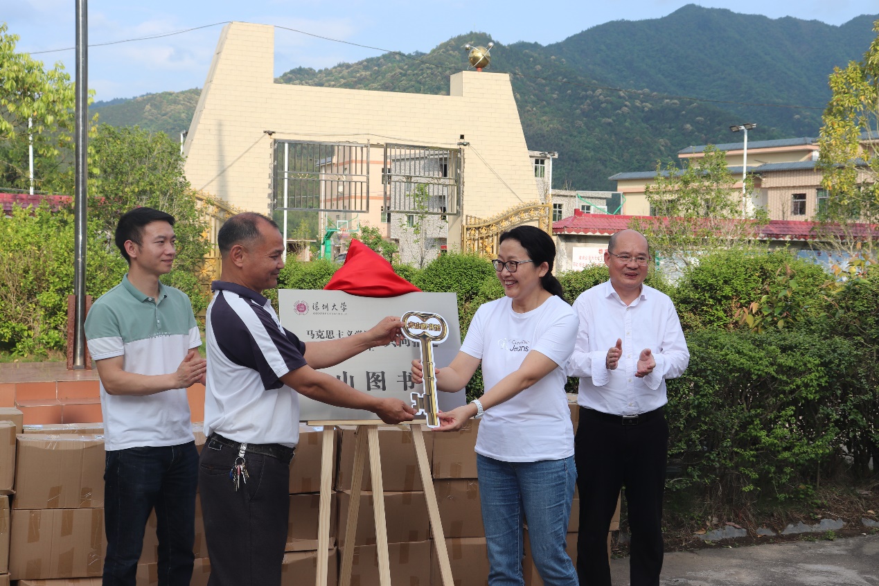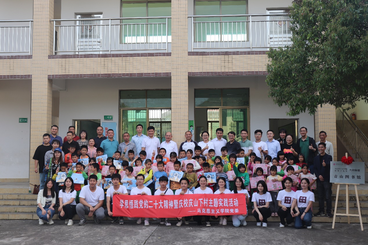 为学思践悟党的二十大精神,深入开展学习贯彻习近平新时代中国特色社会主义思想主题教育,落实党中央、国务院关于动员社会力量参与巩固扩展脱贫攻坚成果同乡村振兴有效衔接的决策部署,马克思主义学院党委大力弘扬马克思主义学风,坚持知行合一、学以致用,充分发挥我院马克思主义理论专业优势,紧密围绕立德树人根本任务和我院研究生培养目标,实践我院师生大局贡献意识和理论服务社会能力,于4月20日组织学院师生党员群众赴河源市和平县浰源镇山下村,在山下小学举行“青山图书馆”交钥匙工程捐赠暨揭牌启用仪式,捐赠图书2324本和体育用品一批,向山下小学52名孩子每人赠送一份学习用品。学校党委常委、学院党委书记王红、院长傅鹤鸣、副书记陈一鸣、思想政治理论课教师、思想政治辅导、党建组织员、研究生党员、入党积极分子等30名师生参加,浰源镇人大副主席、山下村工作组组长刘剑艺,山下村党支部书记、村委会主任邹海飘,浰源镇乡村振兴工作队队长、团市委干部王炜炜,浰源镇乡村振兴工作队副队长、山下村第一书记、马克思主义学院教师杨振宇,浰源镇乡村振兴工作队队员、组织部教师杨建,浰源镇乡村振兴工作队队员、赤龙村第一书记、校团委教师汪江等参加,山下小学校长黄金浓、52名小学生以及部分村民群众出席了活动。