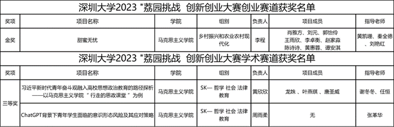 在校团委开展的2023年“荔园挑战”创新创业大赛中,经过书面评审、线下答辩等环节,马院学子在创业赛道及学术赛道斩获一个金奖和两个三等奖。李程(2022级研究生)及所带团队以项目“甜蜜无忧”获创业赛道金奖;黄欣欣(2022级研究生)、龙姝(2023级研究生)、叶燕琪(2023级研究生)、唐圣威(2021级研究生)所组成的团队以项目“习近平新时代青年奋斗观融入高校思想政治教育的路径探析——以马克思主义学院‘行走的思政课堂’为例”获学术赛道三等奖;周雨柔(2022级研究生)以项目“ChatGPT背景下青年学生面临的意识形态风险及其应对策略”获学术赛道三等奖。
