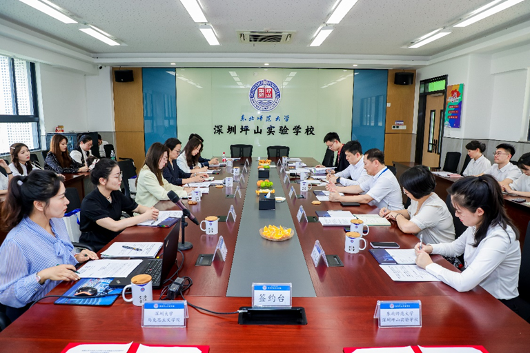 王红介绍了深圳大学马克思主义学院的基本情况以及学院在创新思政教育方面的举措,并介绍了深大马院打造的“行走的思政课——‘星空夜谈’系列活动”和“时代先锋”青年大学生理论宣讲团等特色项目。她希望双方在党建共建、就业实习、理论宣讲等多个领域与东北师范大学深圳坪山实验学校开展密切合作,通过整合双方优质教育资源,建立全方位、立体化的思政教育合作框架。