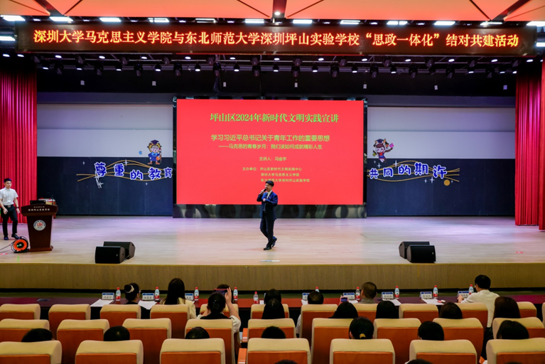 2024年4月12日,深圳大学马克思主义学院党委书记王红、党委副书记王萍,马克思主义学院师生代表一行走进东北师范大学深圳坪山实验学校,开展基层理论宣讲与访企拓岗活动。坪山区区委教育工委书记、区教育局党组书记、局长张秋来,东北师范大学深圳坪山实验学校党支部书记、校长高俊明,副校长柏庆昆及全体道法老师和坪山区区委教育工委和坪山区区委宣传部的工作人员参加了本次活动。