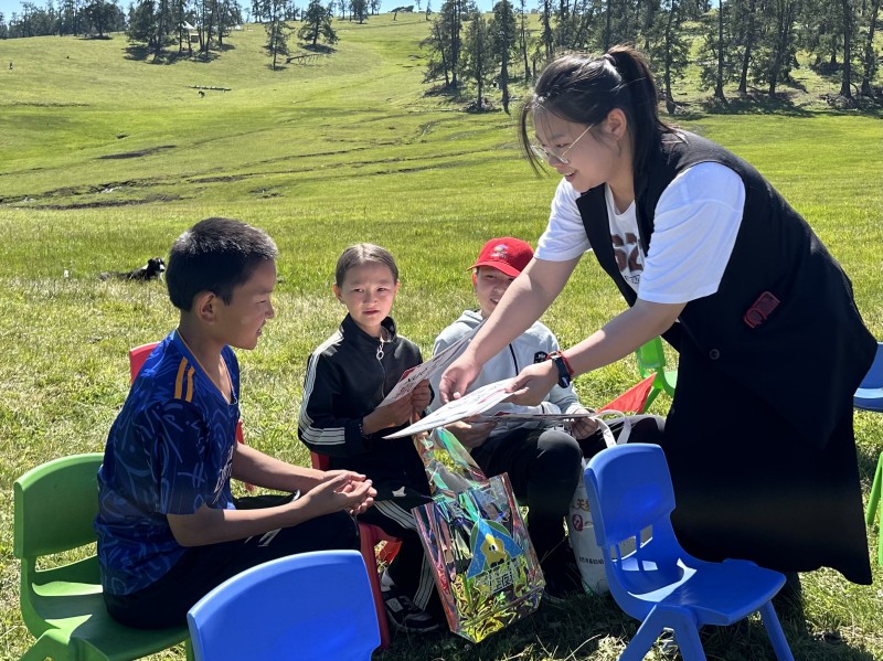 随后,由深圳大学学生部民族办辅导员来再提及马克思主义学院研究生所组成的“送学小分队”,携带着精心设计制作的国通语教学教具,如春风化雨般滋润着牧民的心田。他们围绕《我们的家乡哈巴河》与《守土护边保家园》等主题,创新性地运用情景模拟、互动游戏等寓教于乐的教学方式,巧妙地将语言学习融入到生动活泼的对话交流与角色扮演中。在这一过程中,牧民们全情投入,热情高涨。他们与“送学小分队”的成员们积极互动,不仅在欢声笑语中收获了知识,更在实践中提升了国通语的应用能力。在“送学小分队”的引导帮助下,当地牧民现场可以使用国通语完成简单的日常对话。“以前因为语言不通,出去办事都不方便。今天助学团队的到来,让我们感受到学习国通语的乐趣,我相信自己一定能学好国通语,以后出门就不怕交流困难了。”牧民胡安·俄斯汗笑着说。
