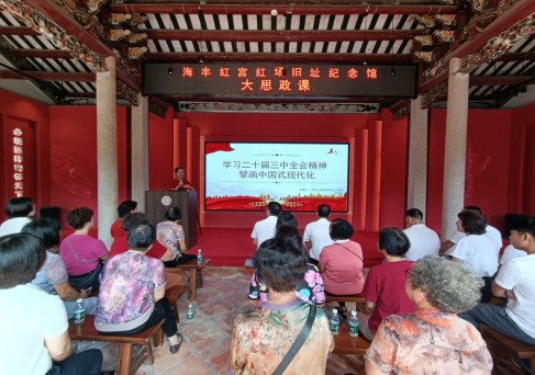 9月27日上午,在汕尾市海丰县红宫红场,毕亚娜老师作了《学习党的二十届三中全会精神 擘划中国式现代化》。她详细回顾了党的历史上的三次“三中全会”,讲解了党的二十届三中全会召开的重大意义,围绕“七个聚焦”“六个坚持”等关键内容,对进一步全面深化改革为中国式现代化提供强大动力和制度保障等内容进行了重点解读。