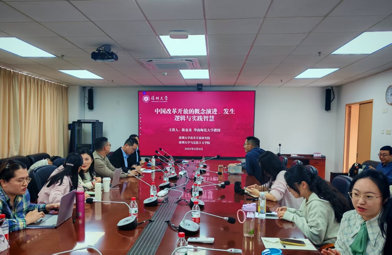 2025年3月8日下午,由改革开放研究院、马克思主义学院联合主办的“改革开放理论与实践”名家讲堂第一期在深圳大学汇文楼1600会议室顺利举行。华南师范大学学术委员会主任、教育部“CJ学者”特聘教授陈金龙教授为深大师生带来了一场题为“中国改革开放的概念演进、发生逻辑与实践智慧”的精彩讲座。本次讲座由深圳大学马克思主义学院副院长张守奎教授主持,众多师生到场聆听。