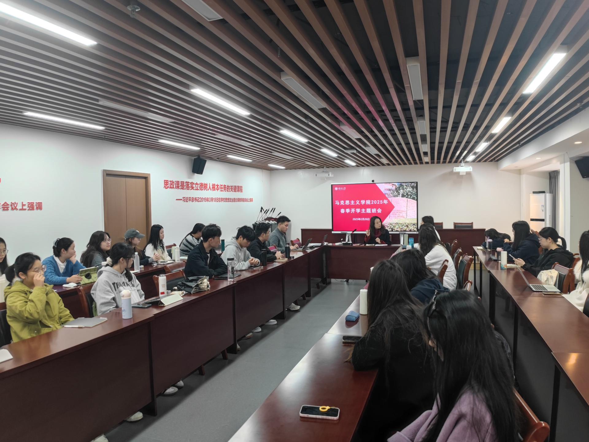 2月26日,在汇文楼2623会议室,马克思主义学院党委副书记王萍为全院学生作2025春季学期主题教育。