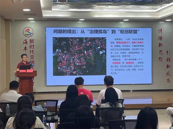 刘华云副教授在海丰县新时代文明实践中心为干部群众详细讲述了《深化党建引领城市社区治理的路径探索》。刘华云凭借深厚理论功底和丰富实证研究,聚焦自治空间压缩、多元参与不足、服务效能滞后等基层治理的痛点问题,结合北站社区、坪山社区的党建引领基层治理模式范本,在系统分析矛盾根源的基础上,以有效区分并落实好党建组织、党建引领为主线,提出了解题思路:党建引领城市社区治理,核心在于系统推进社区党建工作,将党的基层组织嵌入社区治理主体,进而组织动员社区居民、市场组织及社会组织等多元力量参与治理过程,统筹性挖掘、凝聚和调配社区治理资源,最终实现社区共建共治的目标。讲座有思想高度与实践深度,内容翔实、观点鲜明,勾勒出“党建如何引领治理”的施工图,听众普遍表示受益匪浅。