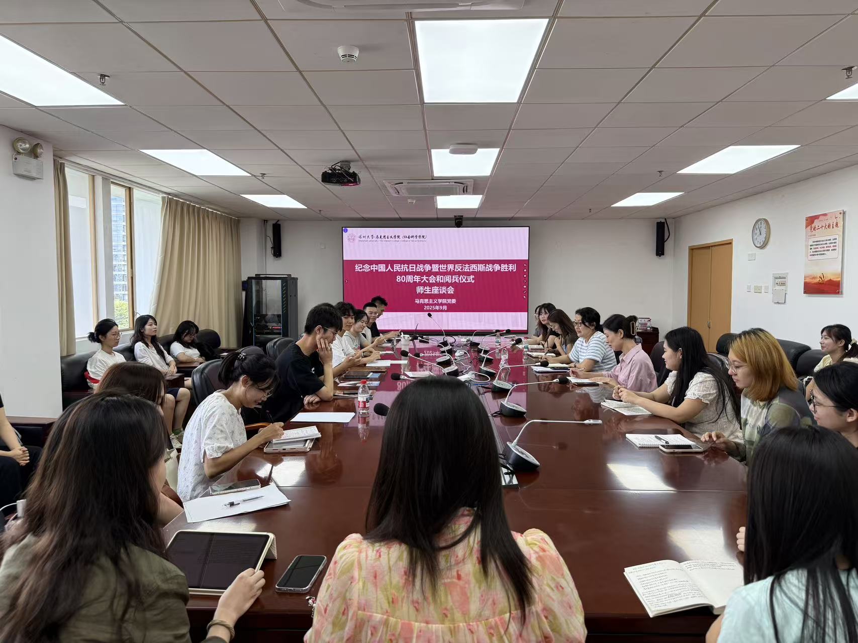 9月3日上午,纪念中国人民抗日战争暨世界反法西斯战争胜利80周年大会在北京天安门广场隆重举行。为铭记历史、缅怀先烈、弘扬伟大抗战精神,9月3日上午,马克思主义学院师生齐聚汇文楼1600会议室,共同收看大会直播及阅兵仪式;9月4日上午,马克思主义学院师生在汇文楼1600会议室共话阅兵,学校党委常委、马克思主义学院党委书记王红教授开讲2025年秋季学期“思政第一课”。党委副书记王萍老师、辅导员边克冰老师,以及30余名学生代表参加活动。
