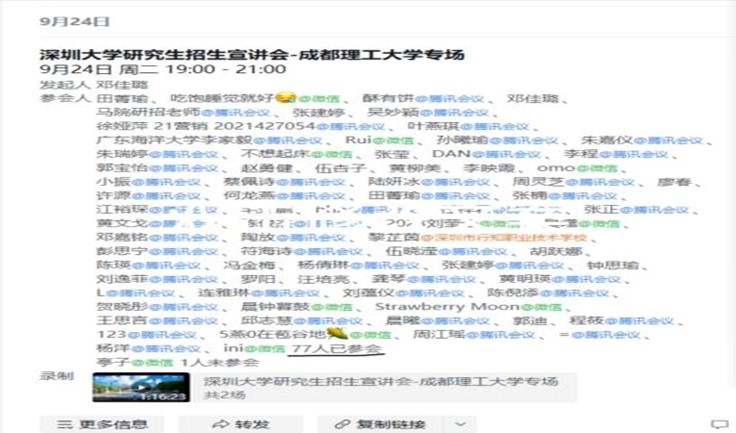 2024年9月24日晚7点到9点,深圳大学马克思主义学院与成都理工大学合作举办了深圳大学线上研究生招生宣讲会-成都理工大学专场。此次活动旨在加强深圳大学与成都理工大学的交流合作,展示学校实力与学科优势,解读招生政策,搭建交流平台,吸引优秀人才报考。马克思主义学院副院长孙婷婷担任宣讲人,来自成都理工大学的70余名师生参加了此次会议。