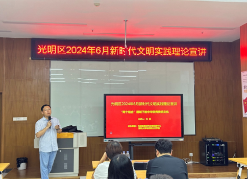 6月13日,在深圳市光明区新时代文明实践中心,石梁助理教授以“两个结合”视域下的中华优秀传统文化为主题开展理论宣讲。他深入浅出地介绍了中国共产党为什么选择了马克思主义,马克思主义与中华文明相融共促的关系,帮助干部群众理解马克思主义与中华优秀传统文化具有内在一致性,加深干部群众对党的创新理论的认同。