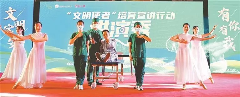 今年9月21日至10月26日,宝安区“文明使者”携手基层文艺工作者连续6个周末晚上,将6场“文明使者”培育宣讲行动讲演秀活动送进街道公园广场。赵梦雪、童定国、沈文静 3位宝安区“文明使者”送上的演讲穿插在融入文明元素的情景剧、小品等文艺节目中,让现场群众感受到不一样的理论宣讲。
