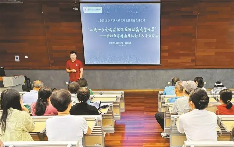 11月4日下午,宝安区新时代文明实践中心举办了一场主题为“以进一步全面深化改革推动高质量发展——科技革命冲击与社会主义事业发展”的理论宣讲。这是今年宝安区文明办、区新时代文明实践中心、深圳大学马克思主义学院联合举办的第4场宣讲活动。