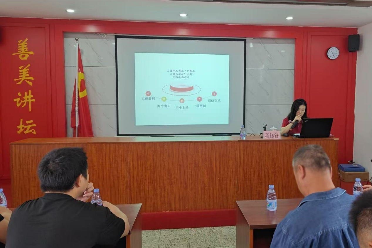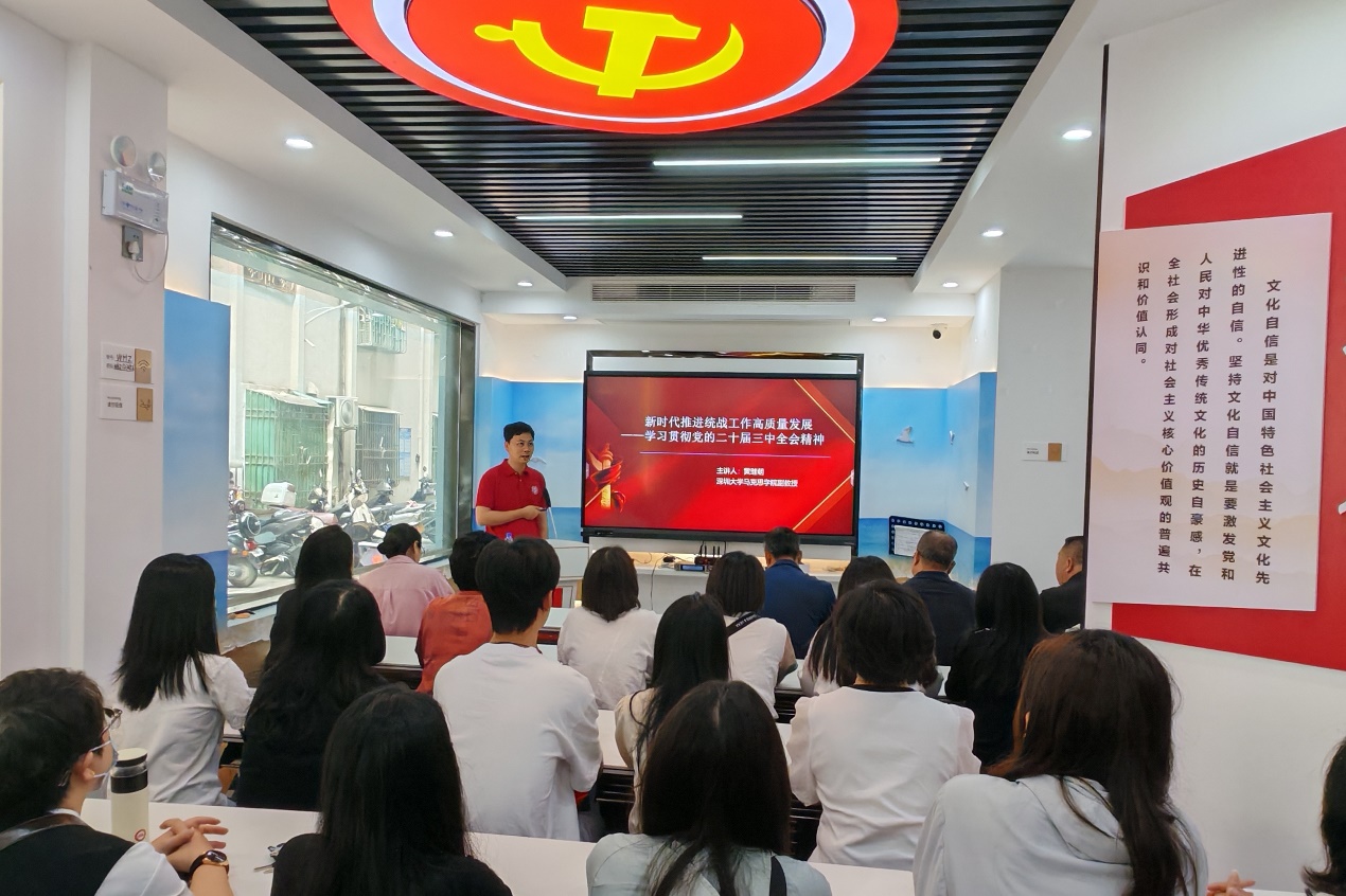 黄继朝副教授在新城街道新时代文明实践所作了题为《新时代推进统战工作高质量发展——学习贯彻党的二十届三中全会精神》的汇报,他围绕新时代推进统战工作高质量发展的核心内容,讲授了在以中国式现代化全面推进中华民族伟大复兴的总体目标下,统一战线如何更好地服务经济发展推动中国式现代化、推进祖国统一以及确保内外稳定安全,发挥凝聚人心、汇聚力量的重要作用。