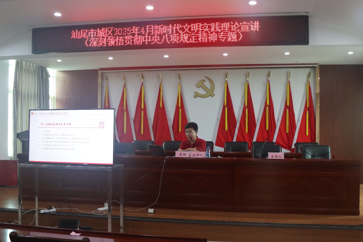 李明助理教授在凤山街道新时代文明实践所围绕《深刻领悟中央八项规定精神》作了专题宣讲,带领基层党员干部和群众代表回顾了中央八项规定提出的原因及其内容,深入阐述了中央八项规定精神的实质、意义和违反中央八项规定精神的具体表现,并结合党中央部署的深入贯彻中央八项规定精神学习教育活动,提出来基层党员干部和群众如何从自身做起认真贯彻落实中央八项规定精神。
